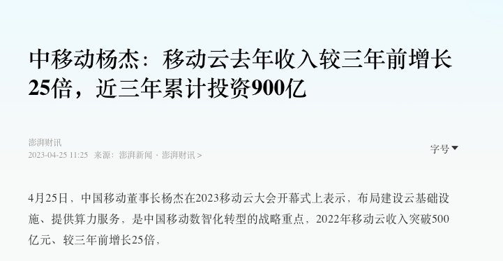 再比如说, 中国移动的云业绩 3 年翻了 25 倍,就是因为 “ 保障国有数据安全 ” 的独特定位带来的。