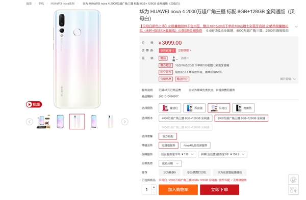 华为nova 4贝母白现已正式开卖,其中2000万超广角三摄/8GB+128GB版售价3099元,4800万超广角三摄/8GB+128GB版售价3399元。