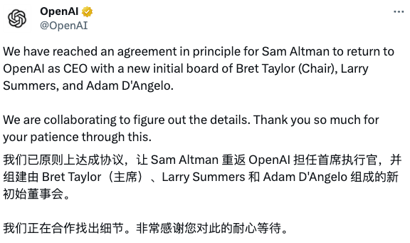 最终,以奥特曼回归重新担任 CEO ,并洗牌董事会落了幕。