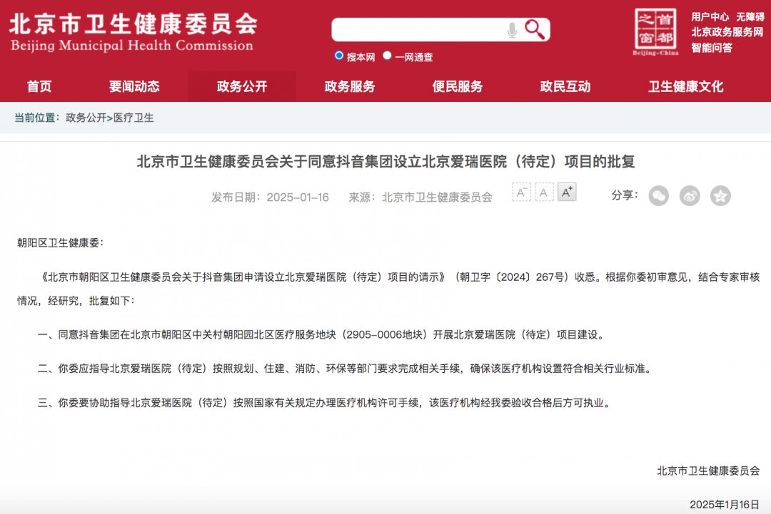 【TechWeb】1月23日消息,据北京市卫建委官网1月16日发布批复,同意抖音集团在朝阳区中关村朝阳园北区医疗服务地块(2905-0006 地块)建设北京爱瑞医院(待定)。