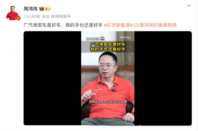 对此,周鸿祎在个人微博发布视频称,“广汽埃安车是好车,手也还是好手。”