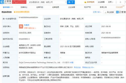 企查查APP显示,8月6日,欧加通信科技(海南)有限公司成立,法定代表人为张昌燕,注册资本5000万元人民币,经营范围包含:计算机系统服务;信息系统集成服务;物联网技术服务;软件销售;通讯设备销售等。