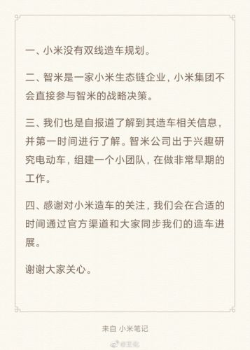 消息称小米双线造车 王化回应:没有相关规划 集团不会直接参与智米战略决策快讯