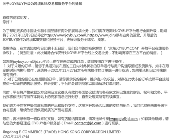 11月25日晚,京东旗下跨境电商出口平台JOYBUY发布公告称,为了帮助更多的中国企业和中国品牌在海外拓展跨境业务,JOYBUY将升级为跨境B2B交易和服务平台,更好地服务于全球买、卖家。