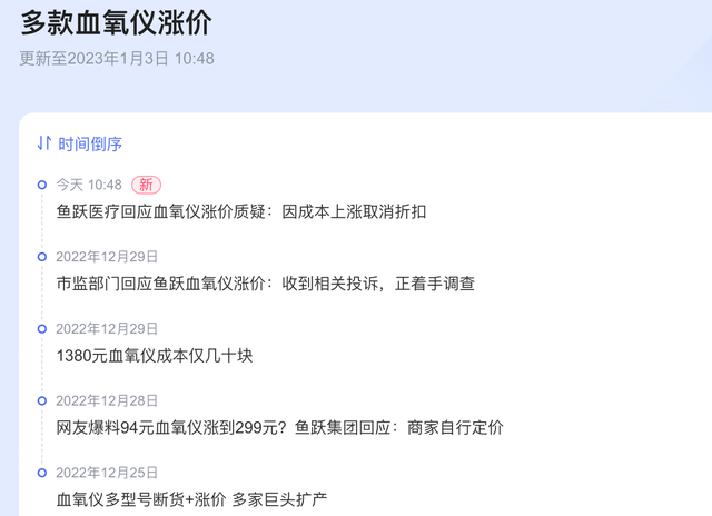 1月3日,A股医疗器械上市公司鱼跃医疗回复称,公司血氧仪产品并未涨价,只是因成本上涨取消折扣。