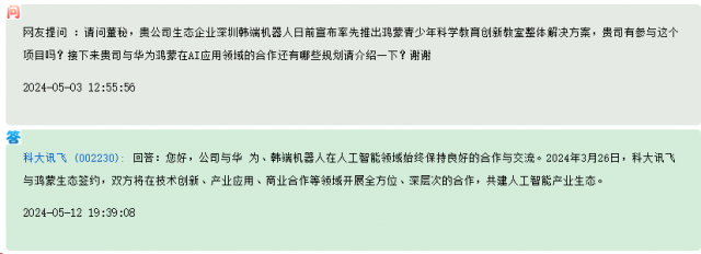 5 月 13 日消息,近日有投资者在互动平台向科大讯飞询问:“公司与华为鸿蒙在 AI 应用领域的合作还有哪些规划?”