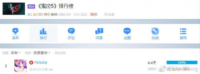 通过大佬的PSN Profile界面可以得知,大佬的确要比他人起跑的要早那么几天,游戏时长达到了6.4小时。但是截至目前全世界仍然只有他一个人位列白金榜,实属天人。