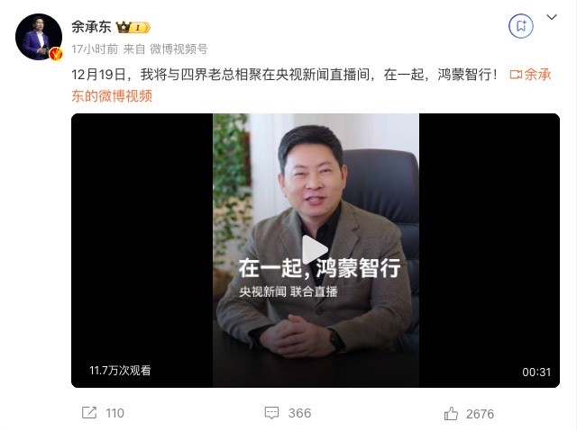 【TechWeb】12月17日消息,今日,央视新闻官方放出了一则《中国经济引力场》节目的先导片,预告了在12月19日,华为常务董事、终端BG董事长、智能汽车解决方案BU董事长余承东将与鸿蒙智行“四界”老板进行的直播活动。