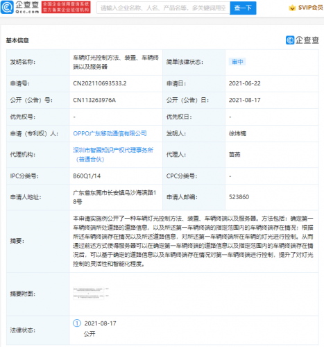 【TechWeb】企查查APP显示,8月17日,OPPO广东移动通信有限公司公开“车辆灯光控制方法、装置、车辆终端以及服务器”专利,公开号为CN113263976A。
