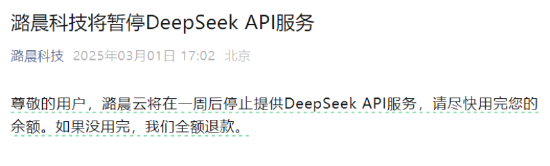 3 月 1 日 17:02 分,就在 DeepSeek 公布线上系统理论成本利润率达 545% 并引发广泛关注后,潞晨科技于官方渠道发文称,“将在一周后停止提供 DeepSeek API 服务,请用户尽快用完您的余额。”