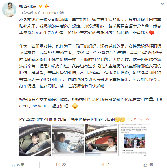 滴滴柳青发博祝福女生:女性努力兼顾家庭与职场不易快报