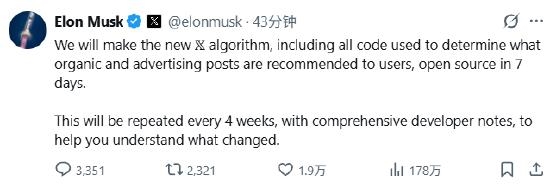 马斯克宣布X平台将开源推荐算法,每四周更新一次代码快讯