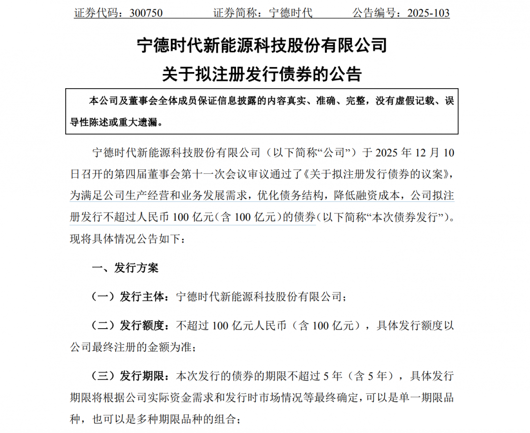 宁德时代:拟注册发行不超过100亿元债券快讯