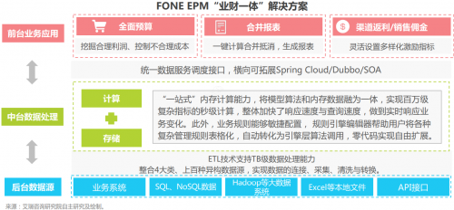 以国内EPM业财一体代表厂商FONE为例,FONE并没有选择普通财务类SaaS厂商过多专注于上层应用的传统模式,而是采用底层平台+上层应用的整合模式,这种模式要求厂商具备扎实的IT技术功底,同时还要具备财务行业深厚经验,对于厂商本身的能力提出了不小挑战。