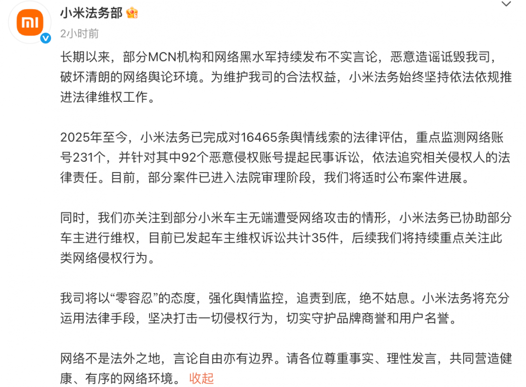 长期以来,部分MCN机构和网络黑水军持续发布不实言论,恶意造谣诋毁我司,破坏清朗的网络舆论环境。为维护我司的合法权益,小米法务始终坚持依法依规推进法律维权工作。