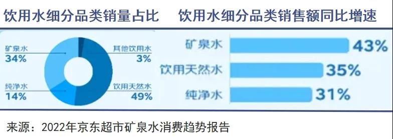 根据京东超市发布的《2022矿泉水消费趋势年度报告》,目前矿泉水销售额增速最快,纯净水最低,消费者更青睐的品类是矿泉水。纯净水的消费占比已经被压缩到14%,行业从纯净水到天然水再到矿泉水的升级路径十分清晰。