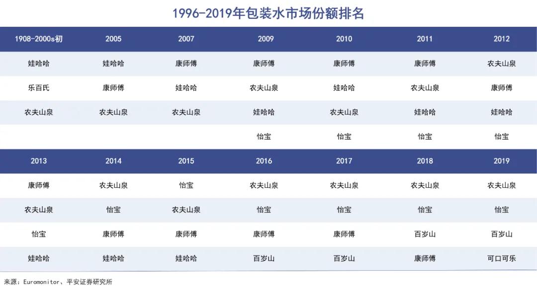 不过,消费者始终对天然水有所偏爱,农夫山泉也在次年重夺全行业榜首的位置。至今,两家仍分居行业第一和第二,合计占有超过了四成的市场。