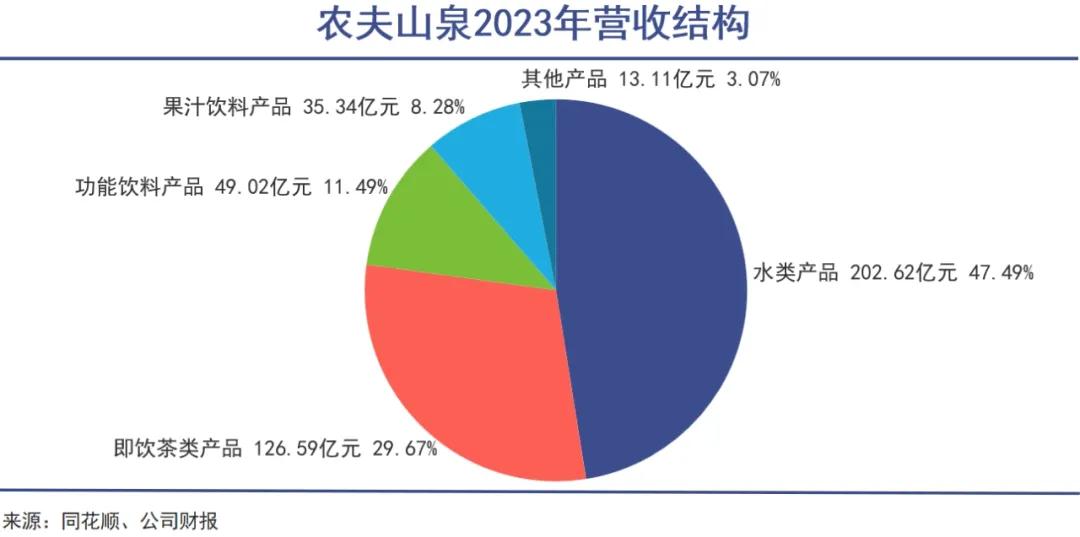 到2023年,饮用水在农夫山泉的盘子里占比已不到一半,这是个更加均衡的收入结构。