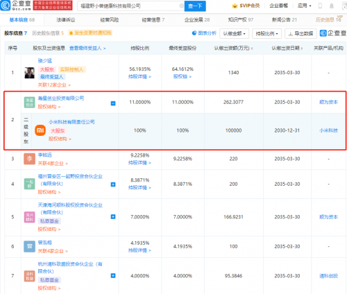 e健身是一款健身服务app,新增小米关联公司瀚星创业投资有限公司为股东,其公司成立于2015年。