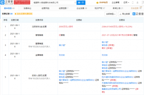 【TechWeb】企查查APP显示,8月16日,福建野小兽健康科技有限公司发生工商变更,新增小米关联公司瀚星创业投资有限公司为股东,同时公司注册资本由2000万元人民币增加至2384.62万元人民币,增幅为19.23%。