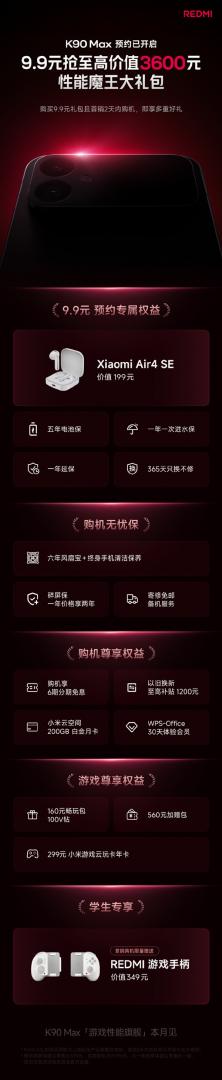 据REDMI官方最新发布的信息显示,REDMI K90 Max将于本月发布,目前已在各大电商平台开启预约。预约页面显示,用户在REDMI K90 Max预约期下单购买9.9元权益包,并于首销期(发布会当日及后一天)购买REDMI K90 Max新机,且7天内手机无退货的用户,可享价值3600元预约礼包。9.9元权益包内容:小米Air4 SE无线耳机+1年延保+5年电池保+365天只换不修+1年1次进水保。