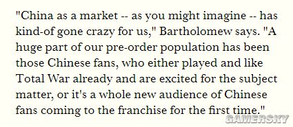 《三国:全面战争》创下了令人目眩的成绩,中国玩家可谓是功不可没。在接受外媒gamesindustry.biz采访时,开发商Creative Assembly公司的CPO Rob Bartholomew就表示:“中国市场——也许你已经猜到了——对此有点狂热。在预购阶段,中国粉丝们做出了巨量的贡献,这其中既有此前玩过《全战》系列、为此次的题材感到激动老玩家,也有第一次接触此系列的中国粉丝。”