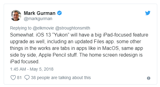 近日,彭博社(Bloomberg)记者马克·格曼(Mark Gurman)在 Twitter 上分享了一则关于 iOS 的信息,声称苹果明年的 iOS 13 更新内部开发代号为 “Yukon”,同时苹果计划在该更新中专门针对 iPad 推出多个重点功能。