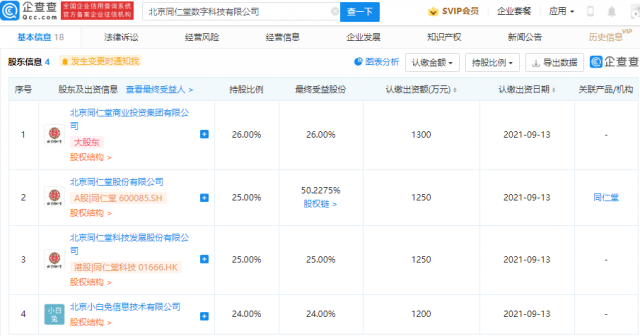 企查查股权穿透显示,该公司由同仁堂(600085)、同仁堂科技(01666.HK)等共同持股。