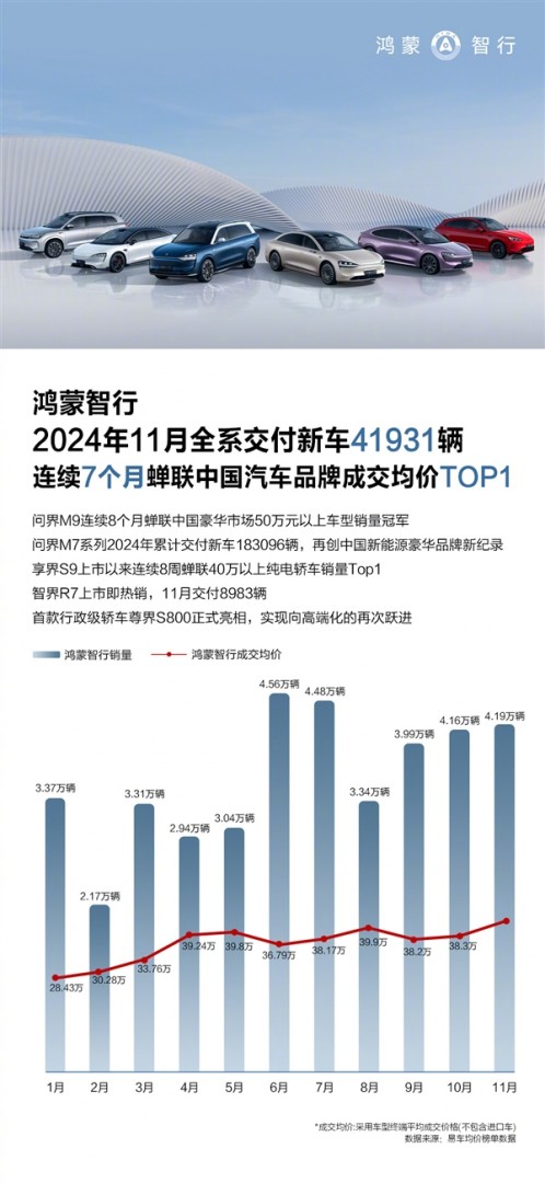 上市以来连续蝉联40万以上纯电轿车销量TOP1,上市13个月累计交付新车23万辆,2024年11月鸿蒙智行全系交付新车41931辆。
