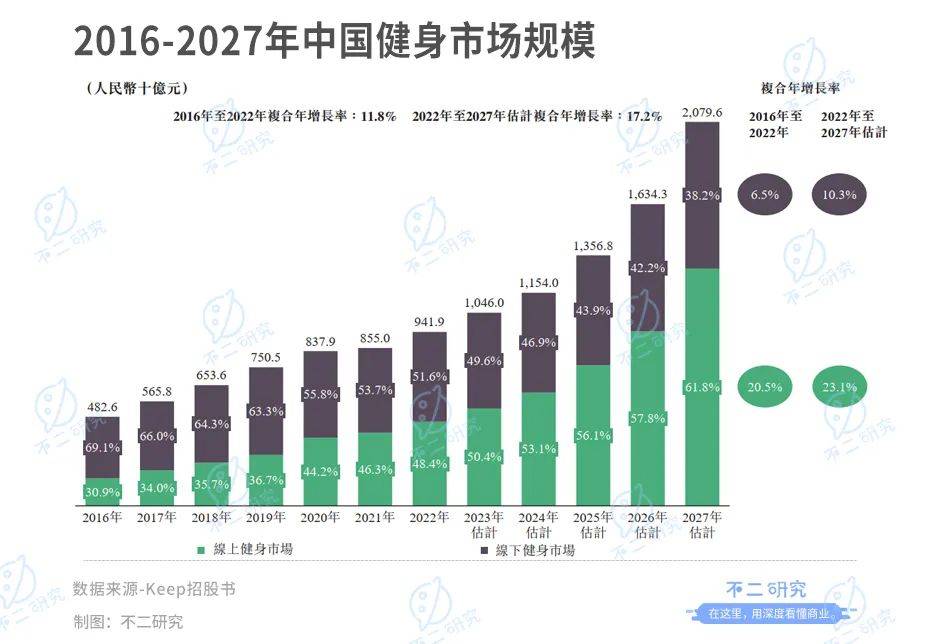 根据灼识咨询报告,按经销渠道划分中国健身市场2016年达4.83千亿元,2022年增至9.42千亿元,复合年增长率11.8%,预计2027年将以17.2%的年复合增长率增至20.77千亿元。其中,2022年中国线上健身市场占中国整体健身市场的48.4%,预计2027年将占61.8%。