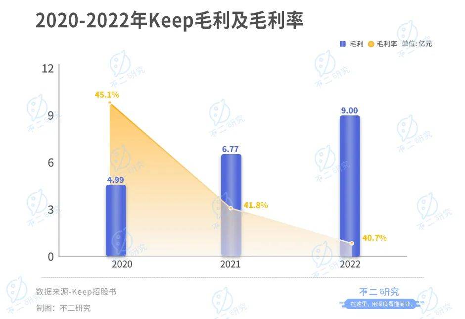 据新版招股书显示,2020-2022年,Keep的收入分别为11.07亿、16.20亿和22.12亿。同期,毛利分别为4.99亿、6.77亿和9.00亿,毛利率45.1%、41.8%和40.7%。
