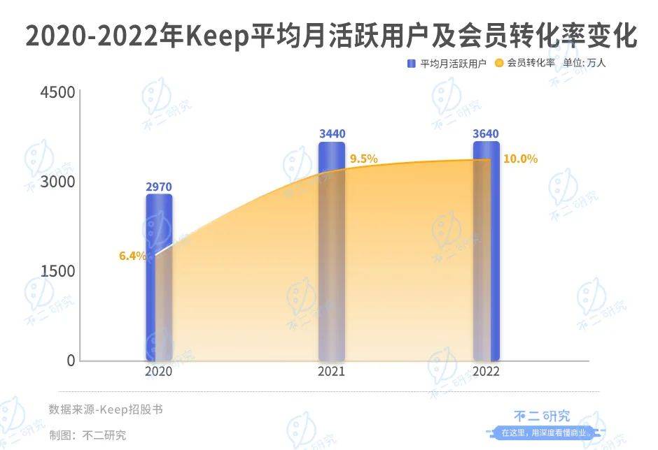 据新版招股书显示,2022年,Keep的平均月活跃用户为3640万人,同比增长仅6%,其中去年二季度平均月度活跃用户达到4108万人。同期,其会员存留率为65.3%。平台上月活跃用户会员的转化率由2020年的6.4%增加到2021年的9.5%,并继续增加到2022年的10%。
