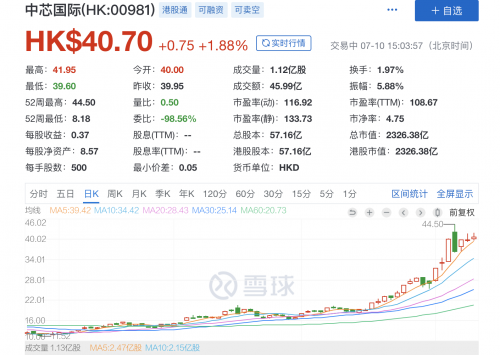 7月5日,中芯国际(688981)确定发行价为27.46元/股,对应的发行前市盈率为83.44倍,绿鞋行使前发行后对应的市盈率为109.25倍,PB估值下发行前市净率3.44倍,对比中芯港股历史在0.7-3倍PB区间波动,H股市场近期已给予近乎5倍的PB估值。截止发稿,中芯国际(00981)在40.5港元上下浮动。