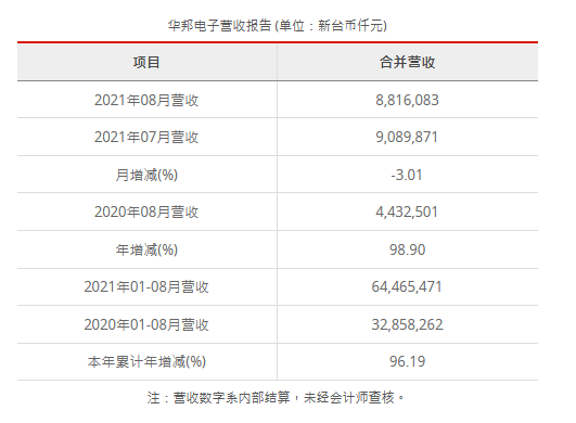 8月份合并营收为新台币88.16亿元,累计2021年1至8月合并营收为新台币644.65亿元,较去年同期增加96.19%。