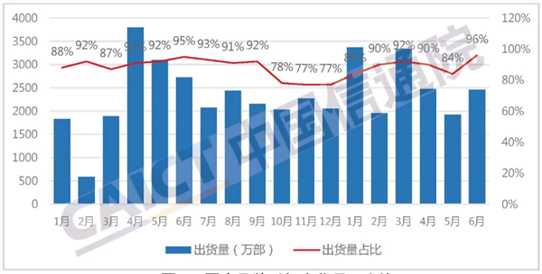 2021年6月,国内手机市场继续受需求提前释放(一季度出货量同比增长100.1%)、移动芯片短缺、华为缺位等因素影响,同比延续下降趋势,但降幅由4、5月的超过30%收窄至10%,并实现环比增长11.7%。