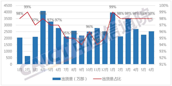 2021年1-6月,智能手机出货量1.71亿部,同比增长14.8%,占同期手机出货量的98.2%。