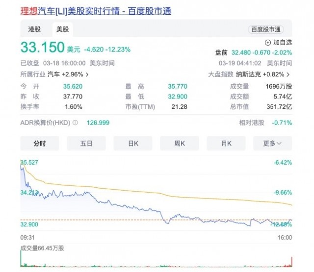 理想汽车美股截至3月18日收盘,跌幅为12.23%,报价33.15美元,总市值为351.72亿美元。