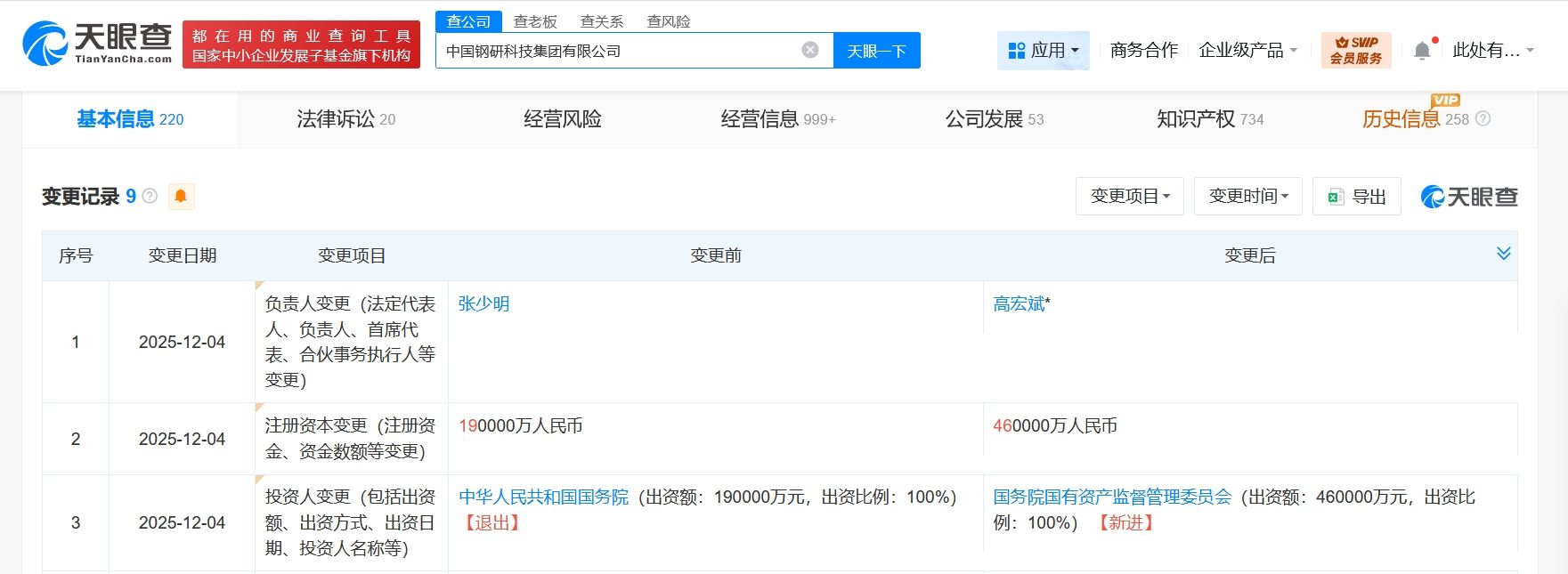 天眼查工商信息显示,近日,中国钢研科技集团有限公司发生工商变更,张少明卸任法定代表人、董事长,由高宏斌接任,注册资本由19亿人民币增至46亿人民币,同时,多位高管均发生变更。
