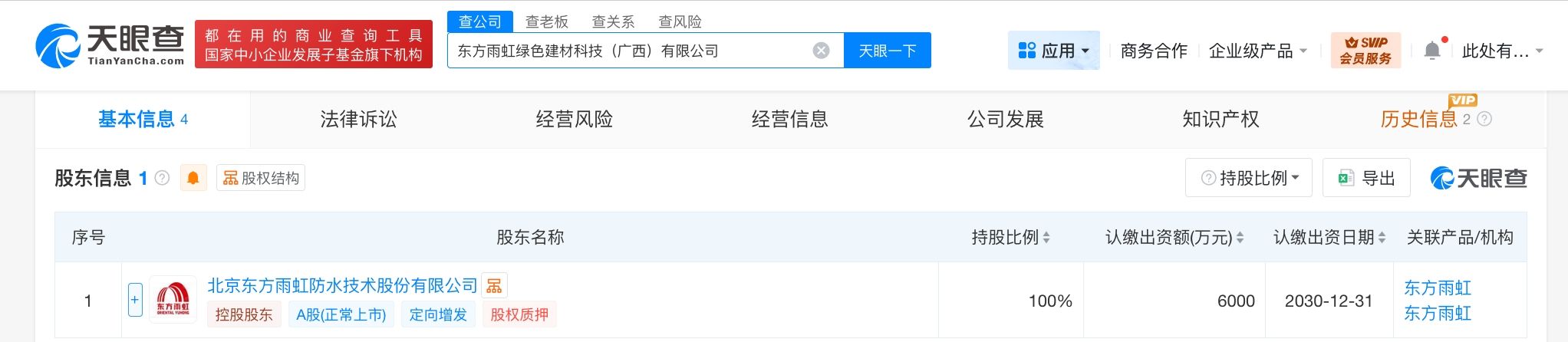 天眼查App显示,近日,东方雨虹绿色建材科技(广西)有限公司成立,法定代表人为李勇,注册资本6000万人民币,经营范围含新材料技术推广服务、新材料技术研发、建筑防水卷材产品销售、水泥制品销售、减振降噪设备销售、机械设备销售、金属结构销售、信息技术咨询服务等。股东信息显示,该公司由东方雨虹(002271)全资持股。
