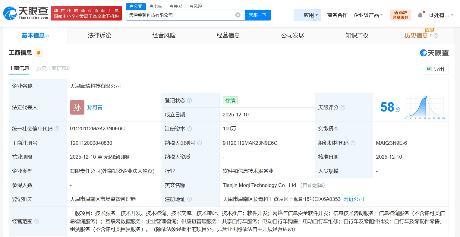 天眼查App显示,近日,天津摩骑科技有限公司成立,法定代表人为孙可青,注册资本100万人民币,经营范围含软件开发、网络与信息安全软件开发、信息技术咨询服务、信息咨询服务、互联网数据服务、企业管理咨询、供应链管理服务、共享自行车服务、租赁服务等,由摩拜(北京)信息技术有限公司全资持股。