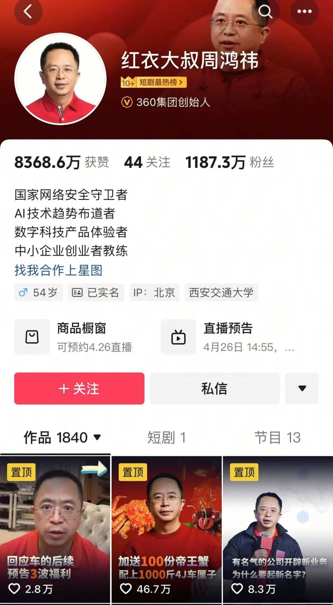 此前,周鸿祎曾发布视频称粉丝超过1000万考虑送车。目前,周鸿祎的粉丝量已超千万。