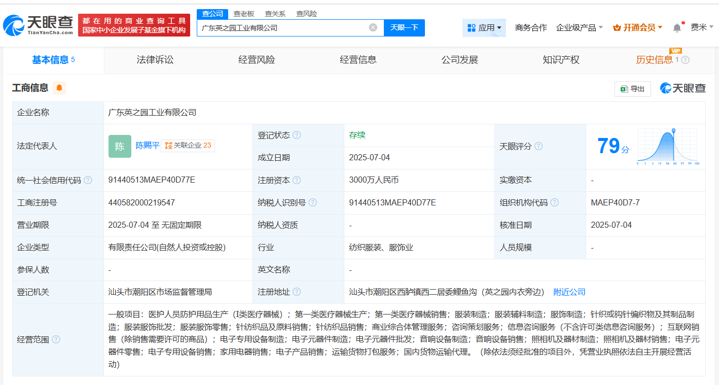 天眼查App显示,近日,广东英之园工业有限公司成立,法定代表人为陈赐平,注册资本3000万人民币,经营范围包括第一类医疗器械生产、第一类医疗器械销售、服装制造、服装辅料制造、服饰制造、针纺织品及原料销售等,由陈赐平、陈赐雄分别持股99%、1%。