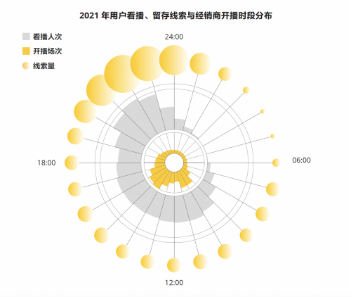 从用户看播习惯来看,夜间和假期是看播高峰期。根据对各个时段的看播情况统计,全天24小时都有用户在懂车帝看播,晚9点是看播高峰,直至夜里11点看播人数仍能和白天持平。夜间直播与经销商传统的朝九晚六工作时间形成互补。