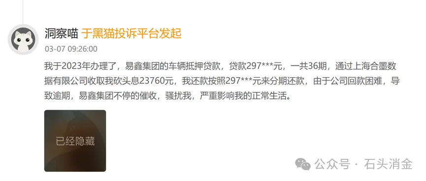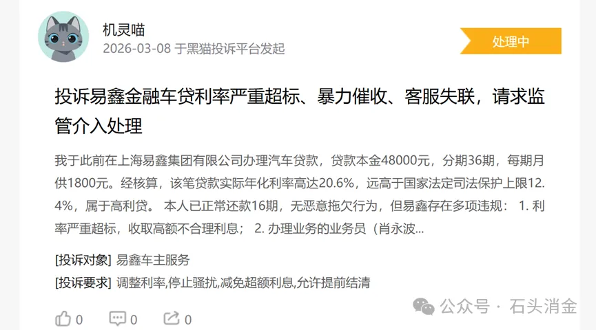 除财务数据外,易鑫的业务合规性也屡遭质疑。根据黑猫投诉平台信息,易鑫车贷业务存在多项争议: