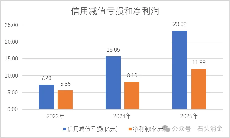 业绩与股价的罕见背离,源于财报中隐藏的深层风险。2025年,公司信用减值亏损高达23.32亿元,相当于当期净利润的1.92倍;更令市场警惕的是,信用减值增速达49%,已超过48%的净利润增速。相较于2023年,减值规模激增200%,而净利润仅增长100%。减值“黑洞”的急剧扩大,正无情吞噬公司的实际盈利成果。