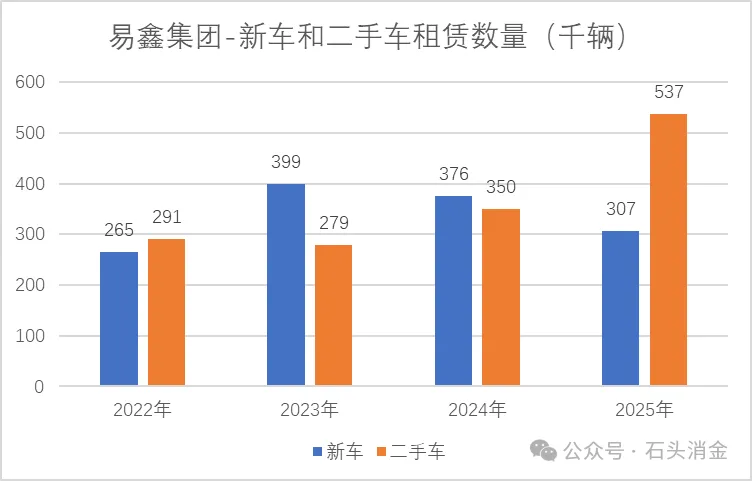 从融资租赁业务构成看,易鑫集团在二手车与新车之间频繁切换。2022年二手车融资占比为52%,2023年降至39%,但2025年又回升至56%,显示出战略方向缺乏连贯性。