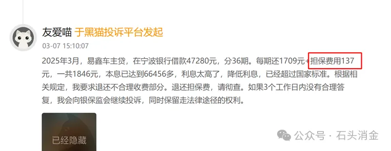 值得注意的是,担保服务的高增长背后也存在争议。根据黑猫投诉平台信息,易鑫在与宁波银行合作的车主贷业务中,会向客户收取137元担保费。按还款周期测算,客户承担的实际利率接近24%。