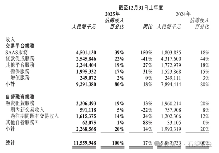 财报显示,2025年,易鑫集团营业收入115.6亿元,分为交易平台业务和自营融资租赁业务,其中交易平台业务又分为SAAS服务、贷款促成服务和其他平台服务,自营融租业务分为融资租赁业务和其他自营业务。