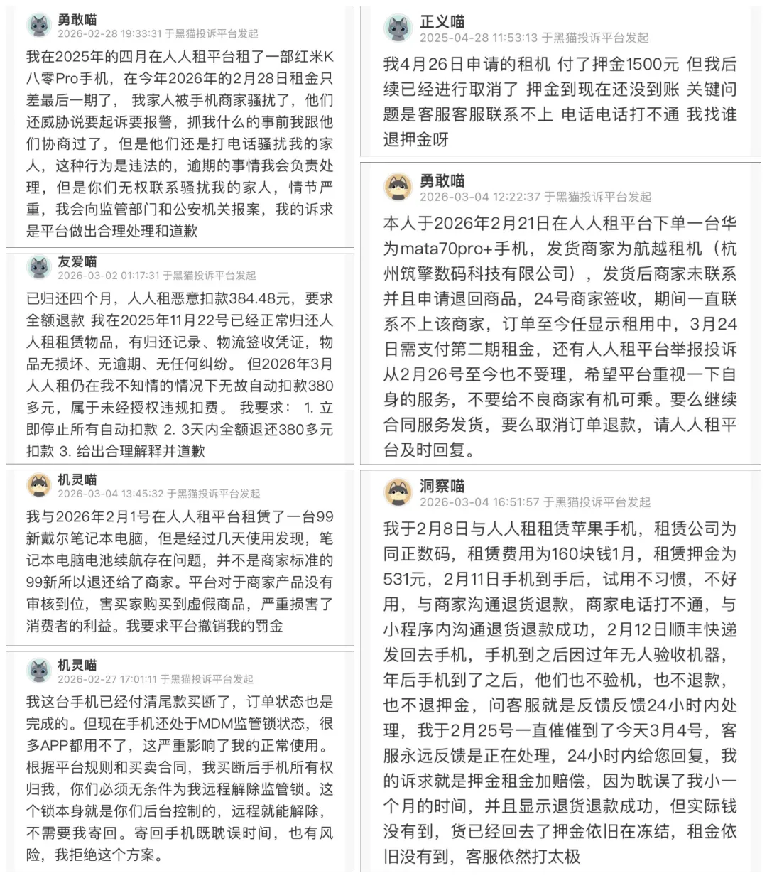 尽管人人租针对央视曝光的问题,宣布下架涉事店铺、启动全面整改,但从实际投诉情况来看,相关问题并未得到彻底解决。在黑猫投诉平台上,截至2026年3月4日,“人人租”的相关投诉已超过1.8万条且投诉量还在持续上升,内容集中在“霸王条款”、“产品质量”“不退押金”“乱扣费”“售后服务欠缺”“监管锁不解除”等问题,部分用户甚至遭遇“爆通讯录”等不当催收。