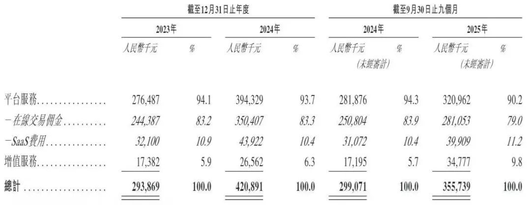 其中,在线交易服务是人人租的第一大收入来源,2023年至2025年前三季度实现收入2.44亿元、3.5亿元和2.81亿元,分别占总收入的83.2%、83.3%和79%;同期,SaaS服务实现3210万元、4392.2万元和3990.9万元,分别占总收入的10.9%、10.4%和11.2%。这意味着,平台服务收入始终占总营收的90%以上。业务结构的“偏科”,不仅限制了未来的想象空间,更将经营风险高度聚焦,成为其估值模型中不容忽视的减分项。